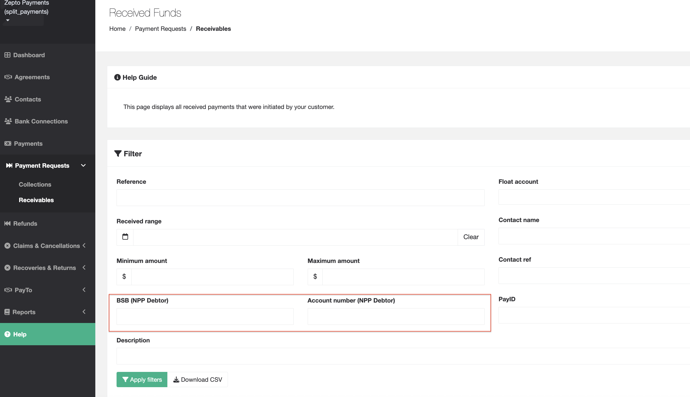 Merchants can now filter the receivable payments requests by the originating customer's bank account details (BSB and account number). Two new filter fields are added to **Merchant UI **Payment Requests → Receivables.